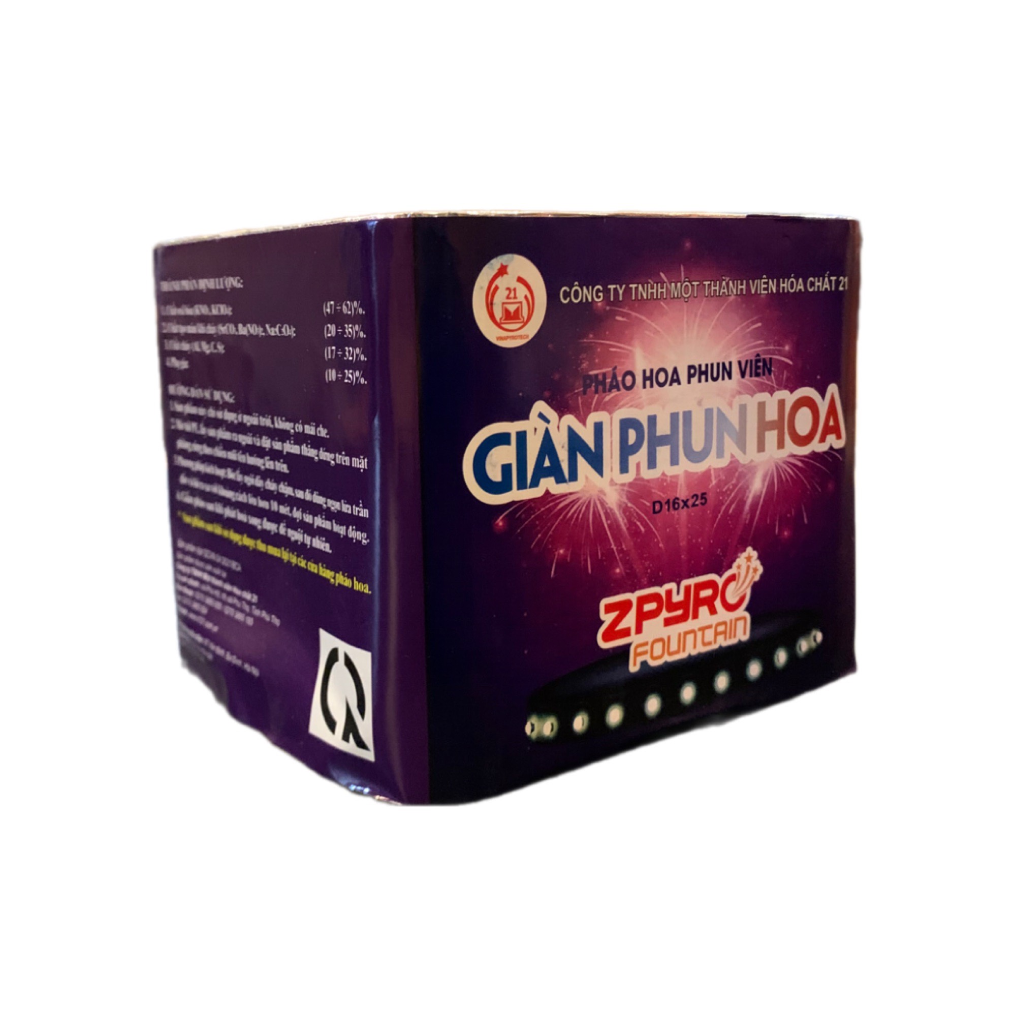 Giàn phun hoa D16x25 – Pháo hoa rực rỡ an toàn hợp pháp Giàn phun hoa D16x25 là dòng pháo hoa không tiếng nổ, được sản xuất bởi nhà máy Z121 – Bộ Quốc Phòng. Khi đốt, pháo phun ra chùm viên sáng nhiều màu sắc như đỏ, vàng, xanh lục, xanh lơ… kết hợp hiệu ứng nổ lách tách đẹp mắt trong quá trình bay. Sản phẩm bắn tuần tự từ ống đầu tiên đến ống cuối, mang đến trải nghiệm sống động và an toàn.